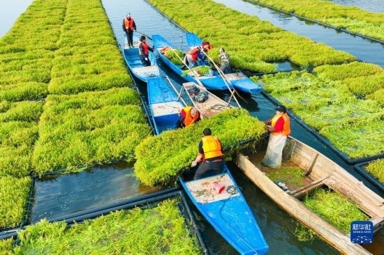 近年來,浙江省杭州市淳安縣在千島湖典型庫灣、入湖口等區(qū)域,積極運用生態(tài)浮島水上植物無土栽培技術(shù)種植空心菜、水芹菜等水生蔬菜,直接吸收庫區(qū)水體中氮磷等元素,從而能夠有效地降低水體中營養(yǎng)物質(zhì)的含量,提升水質(zhì)。近日,水生蔬菜進(jìn)入采收季節(jié),“湖上菜園”呈現(xiàn)春收繁忙景象。