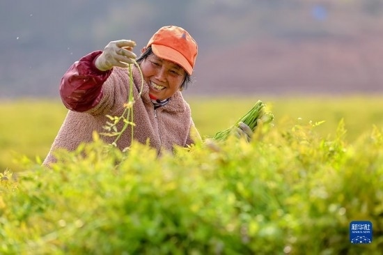 2月17日,浙江省杭州市淳安縣千島湖鎮(zhèn)坪山生態(tài)浮島上,工作人員忙著采摘水生蔬菜。