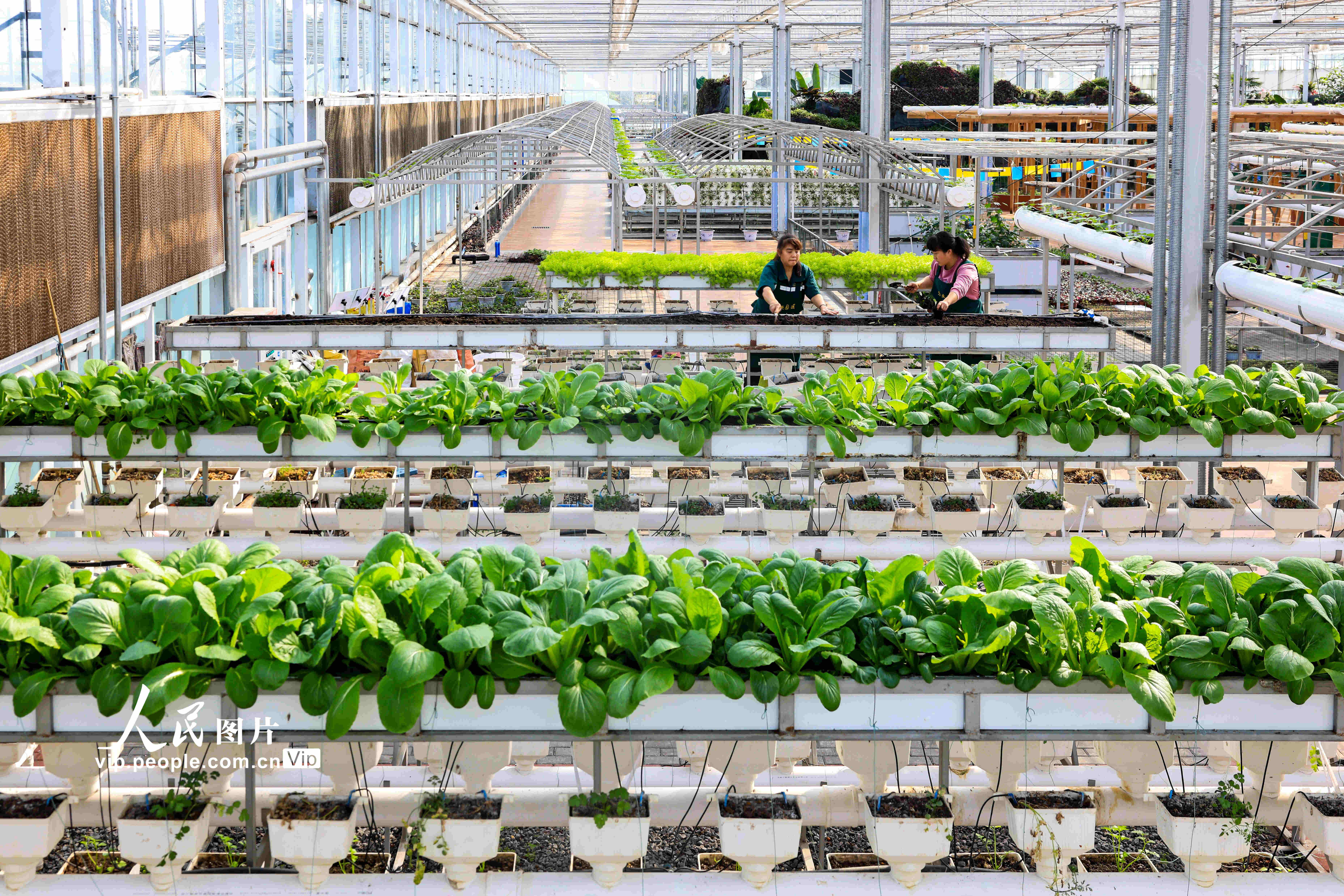 2023年2月26日,在四川省瀘州市江陽區(qū)現(xiàn)代農業(yè)園區(qū)的高科技溫室種植大棚內,工人們忙著養(yǎng)護栽種的蔬菜。張若涵攝(人民圖片網)