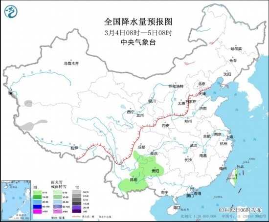 3月4日08時(shí)至5日08時(shí),新疆南疆西部山區(qū)、西藏西部等地部分地區(qū)有小到中雪,局地有大雪(5~9毫米)。四川南部、貴州中西部、云南中南部等地部分地區(qū)有小到中雨。內(nèi)蒙古中東部、遼東半島等地部分地區(qū)有4~5級(jí)風(fēng)。臺(tái)灣海峽、巴士海峽、南海中東部海域有5~7級(jí)風(fēng),陣風(fēng)8級(jí)。