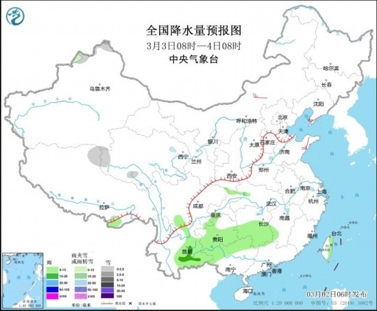 全國降水量預(yù)報(bào)圖(3月2日08時(shí)-3日08時(shí)) 圖片來源:中央氣象臺(tái)網(wǎng)站