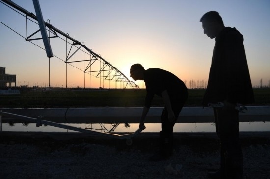 3月14日,在西平縣老王坡高標準農田示范區(qū),劉亞輝(左)在調整噴灌機的移動方向。
