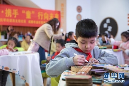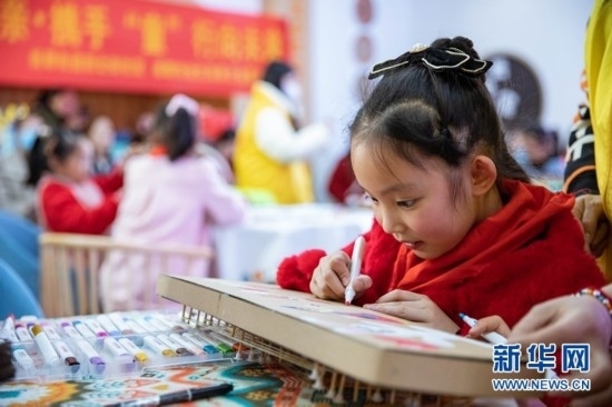 8歲的土旦卡卓是來自青海玉樹藏族自治州的藏族小朋友,她在為手中紙質瑤琴涂畫的同時也學習著其他民族的文化風俗。