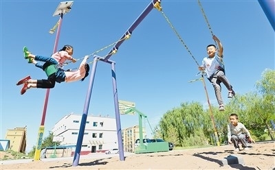 去年以來(lái),甘肅省張掖市民樂(lè)縣把生態(tài)及地質(zhì)災(zāi)害避險(xiǎn)搬遷與城鎮(zhèn)化建設(shè)相結(jié)合,推動(dòng)城鄉(xiāng)融合發(fā)展。圖為搬遷到民樂(lè)縣樂(lè)民新城的孩子們?cè)谛^(qū)內(nèi)玩耍。王 將攝(人民圖片)
