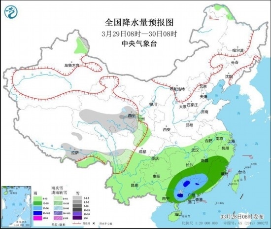 3月29日08時至30日08時,西藏南部、青海南部和東部、甘肅西南部、川西高原等地部分地區(qū)有小雪或雨夾雪,其中,青海東部局部有中雪。江南中南部、華南大部等地部分地區(qū)有中到大雨,其中,廣西東部、廣東西部等地部分地區(qū)有暴雨(50~75毫米)。內(nèi)蒙古東部、黑龍江西部等地部分地區(qū)有4~6級風(fēng)(見圖2)。臺灣海峽將有5~7級、陣風(fēng)8級的東北風(fēng)轉(zhuǎn)偏北風(fēng)。