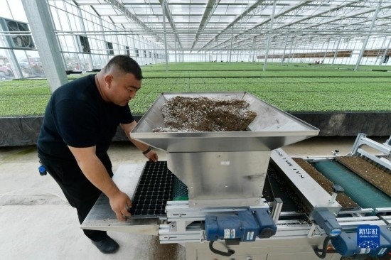 在張掖市甘州區(qū)黨寨鎮(zhèn)陳寨村,工作人員使用穴盤育苗機育苗(4月10日攝)。