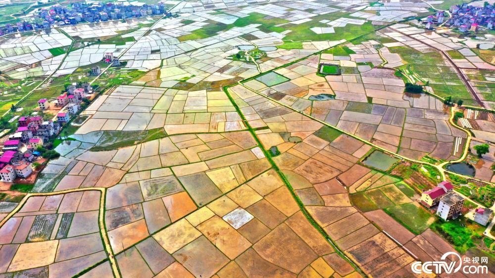 2023年4月12日,江西吉安,永豐縣佐龍鄉(xiāng)香山村,從空中俯瞰春耕稻田,色彩斑斕如拼圖。