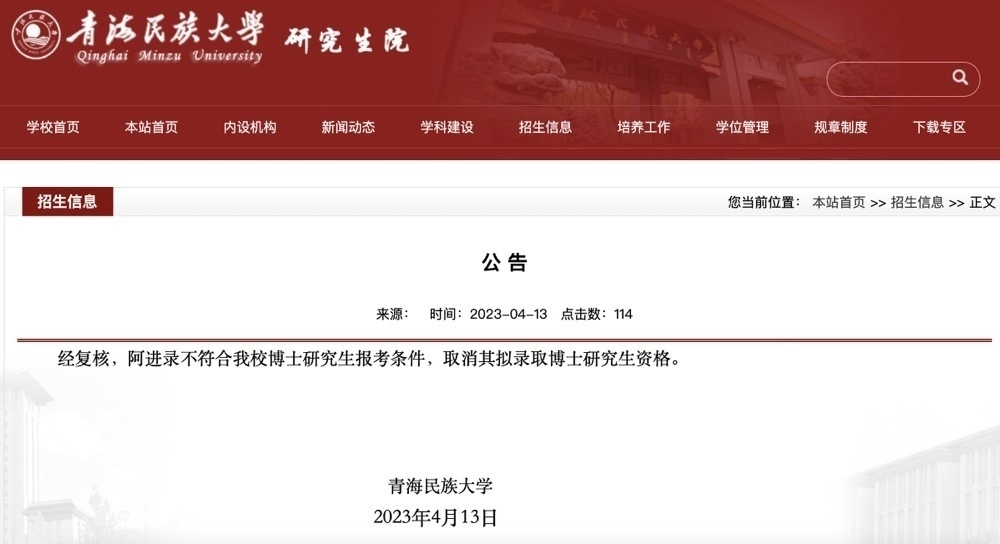 ·青海民族大學(xué)回應(yīng)黨委副書記擬錄取為本校博士:取消資格。