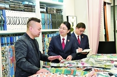 浙江省紹興市柯橋區(qū)被稱為“國際紡都”。2022年,柯橋區(qū)人民檢察院通過大數(shù)據(jù)監(jiān)督模型,監(jiān)督糾正62件花樣著作權(quán)虛假訴訟案件,入選2022年知識產(chǎn)權(quán)檢察十大案事例。圖為辦案人員在走訪商戶。柯橋區(qū)人民檢察院供圖