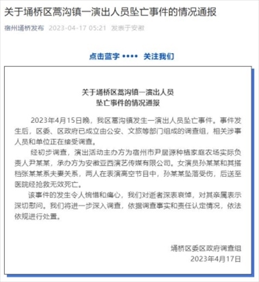 ·安徽宿州埇橋區(qū)委區(qū)政府調(diào)查組通報(bào)“雜技演員墜亡”:涉事人員和單位接受調(diào)查。