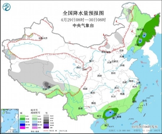 4月29日08時至30日08時,內(nèi)蒙古東北部、新疆南疆盆地西部、西藏大部、青海西部、川西高原南部等地部分地區(qū)有小雪或雨夾雪,其中,西藏東南部等地部分地區(qū)有中到大雪(5~8毫米)。東北地區(qū)大部、江南東部和南部、華南大部、臺灣島等地部分地區(qū)有小到中雨,其中,吉林東部、遼寧北部、廣西東部、廣東中西部等地部分地區(qū)有大雨(25~45毫米)。內(nèi)蒙古中北部、黑龍江東北部、青海東部、江西北部、貴州西南部、廣西東北部等地部分地區(qū)有4~6級風。