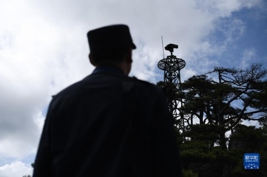4月20日,秦志平在黃山風(fēng)景區(qū)對(duì)林火監(jiān)測(cè)系統(tǒng)進(jìn)行巡看。