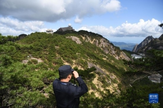 4月20日,秦志平在黃山風(fēng)景區(qū)觀測(cè)山林。
