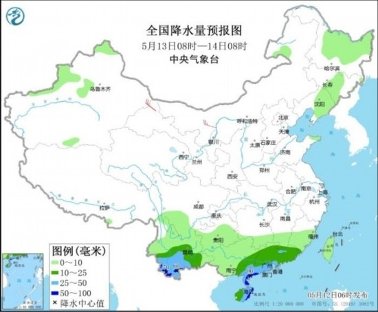 5月12日08時至13日08時,西南地區(qū)南部、華南南部和海南島等地部分地區(qū)有中到大雨,其中,廣東西南部沿海、海南島大部等地部分地區(qū)有暴雨或大暴雨(100~180毫米)。內蒙古西部部分地區(qū)有4~6級風。