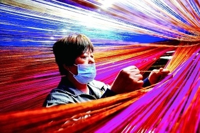在山東惠民縣辛店鎮(zhèn)“惠民工坊”,一名女員工在接紡線(xiàn)。新華社發(fā)