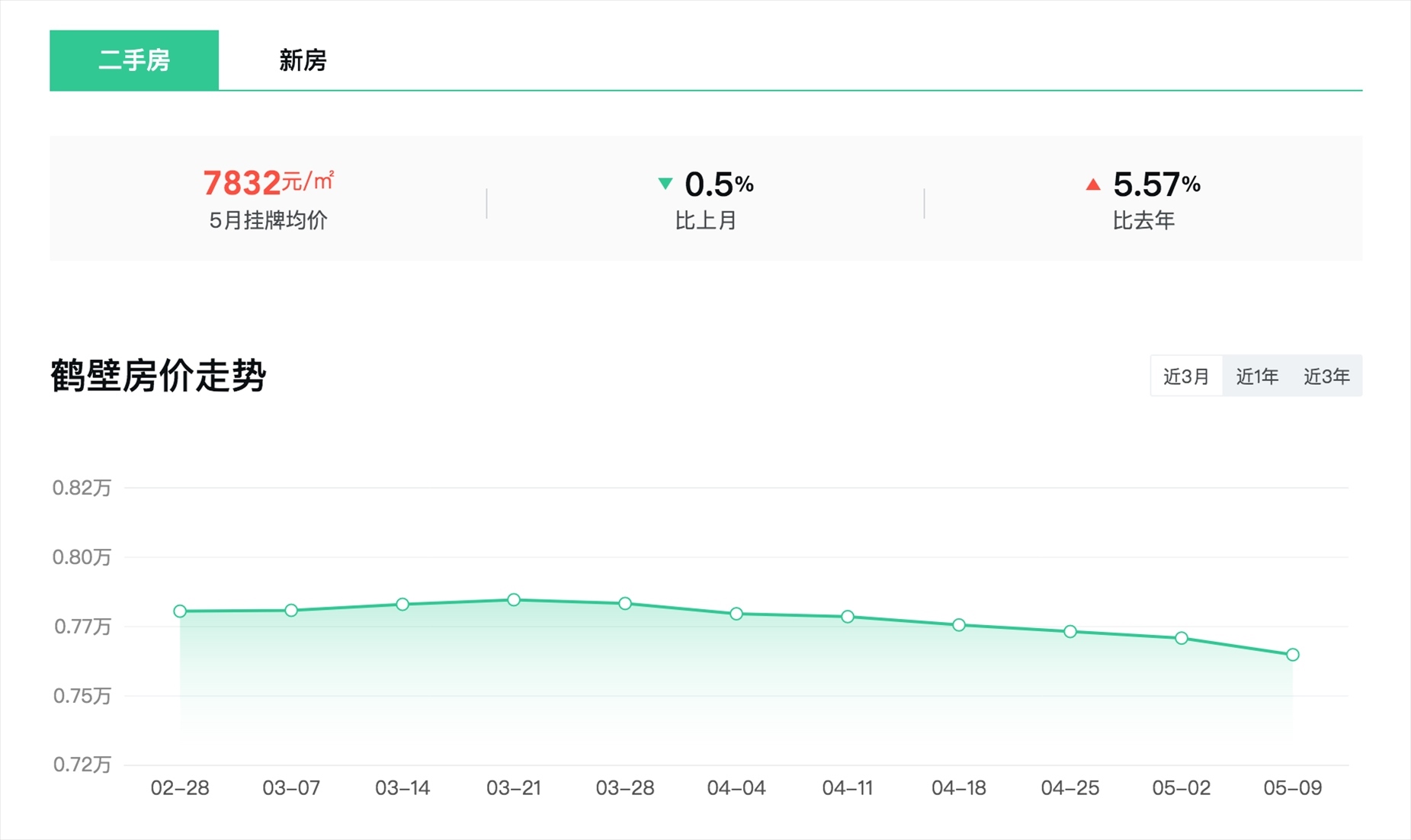從安居客平臺上可以看到,5月,鶴壁整體的二手房掛牌均價為7832元/平方米,環(huán)比下跌0.5%,同比上漲5.57%。下轄的5個行政區(qū)的房價差異則較大。其中,鶴壁新區(qū)淇濱區(qū)二手房掛牌均價為7565元/平方米,環(huán)比下跌0.68%,同比上漲3.49%;而老城區(qū)山城區(qū)二手房的掛牌價僅顯示1465元/平方米。