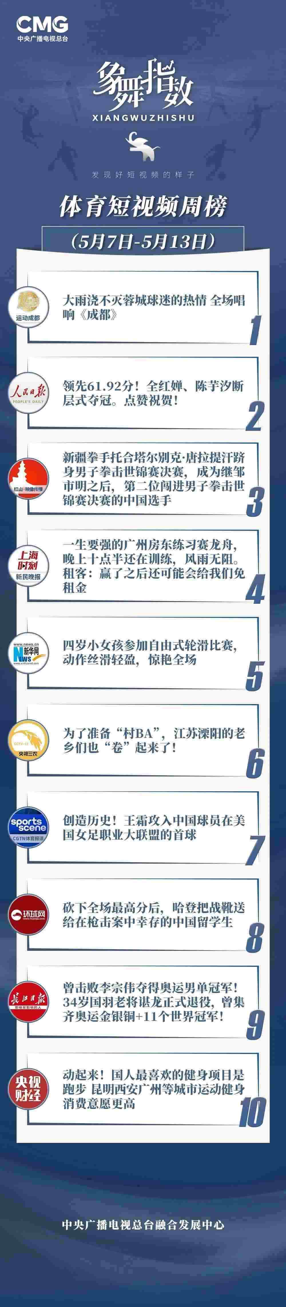 中央廣播電視總臺“象舞指數(shù)”評議品牌,推出體育短視頻周榜、總臺體育短視頻周榜。在5月7日—5月13日,以下內(nèi)容獲得矚目: