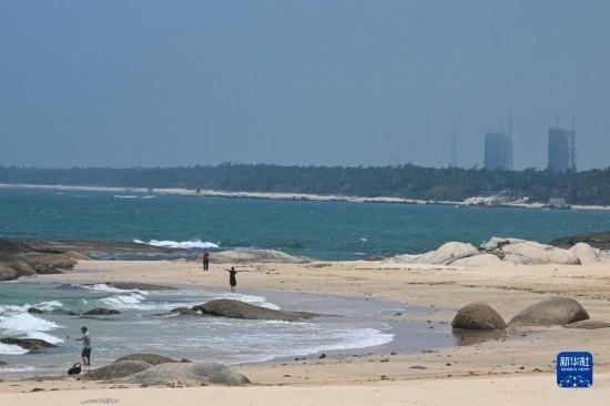 5月17日,游客在海南省文昌市淇水灣游玩,這里可以望見文昌航天發(fā)射場的發(fā)射塔架。