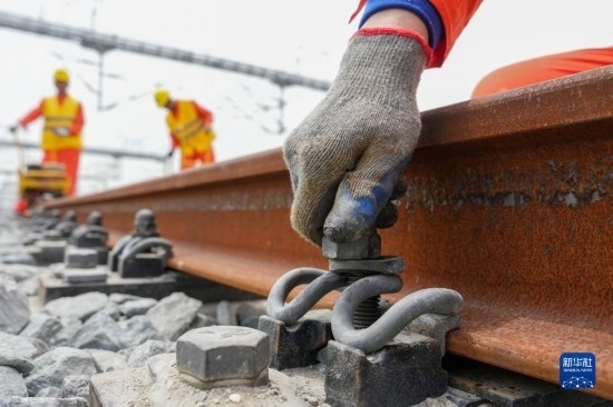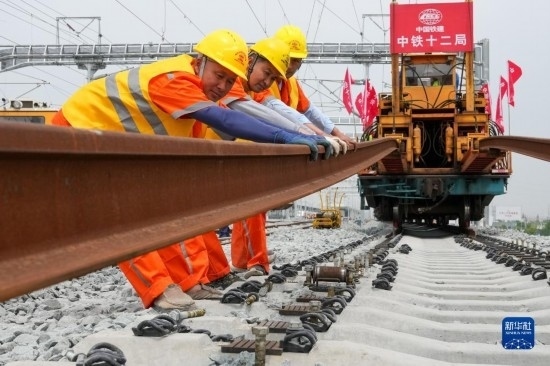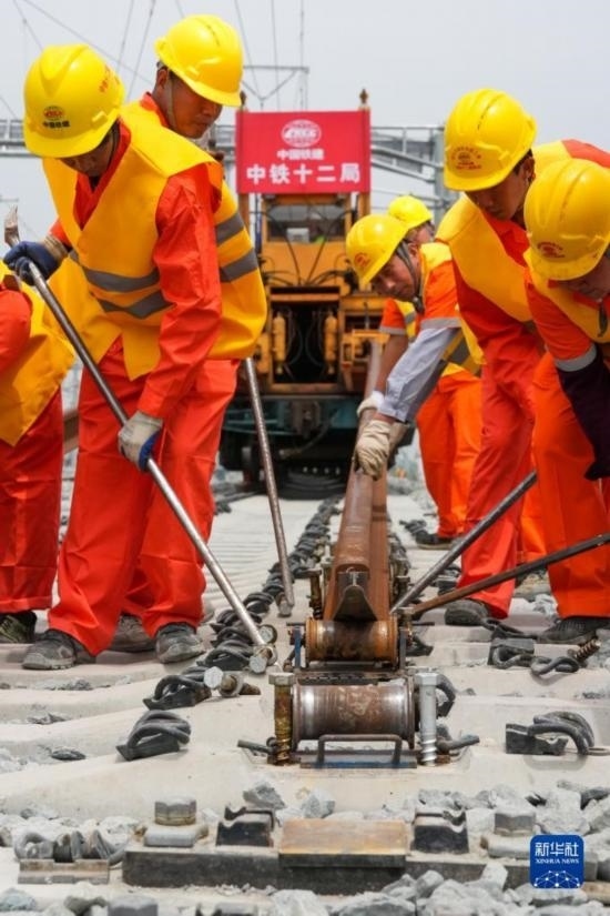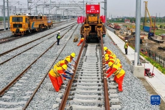 5月20日,在滬寧沿江高鐵太倉站施工現(xiàn)場,中鐵十二局的工程人員準(zhǔn)備進行螺栓緊固作業(yè),將對接好的鋼軌固定。
