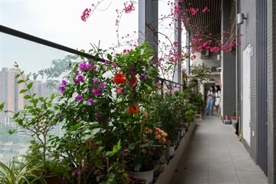 ■ 在這面美麗的花墻背后,是小區(qū)開發(fā)商和樓棟240戶人家,共同打造出的花草童話——由開發(fā)商種植的三角梅在交房時(shí)一并移交給業(yè)主,業(yè)主在門口的公共空間打造屬于自己的“小花園”。10年時(shí)間過去,240戶居民打造出了32層高的三角梅,還有繡球、蝴蝶蘭、多肉等綠植,櫻桃樹、桃樹、葡萄藤等水果植物,花椒、大蒜、番茄、西蘭花等蔬菜。
