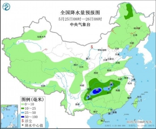 全國降水量預(yù)報圖(5月25日08時-26日08時)
