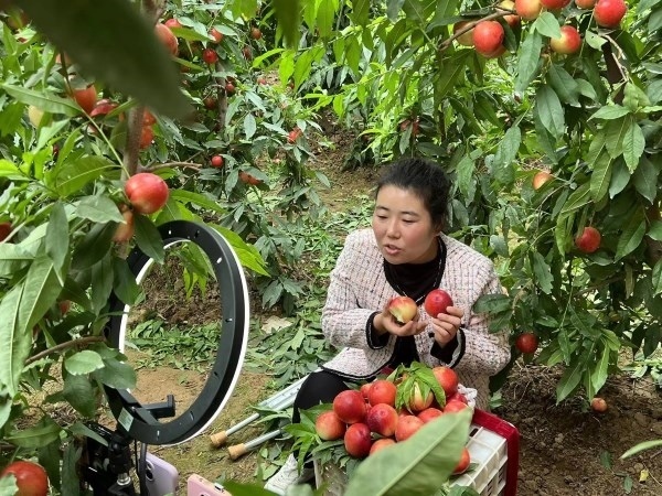 “看,這就是我們陜西大荔正宗的大紅油桃。皮薄肉厚、脆甜多汁,歡迎大家品嘗!”