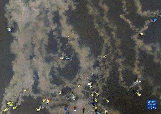 5月30日,在淮安市洪澤區(qū)岔河鎮(zhèn),人們在插秧節(jié)上參加摸魚比賽(無人機照片)。