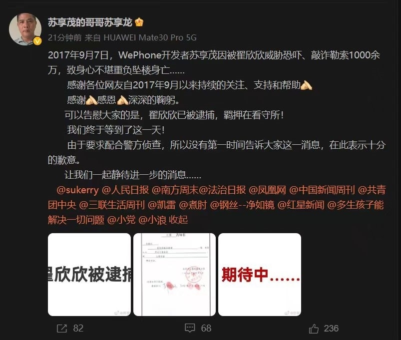 事發(fā)5年多之后,2023年6月9日,蘇享茂的哥哥蘇享龍通過個(gè)人微博稱,“翟欣欣已被逮捕,羈押在看守所?!碧K享龍?zhí)峁┑募由w北京海淀區(qū)公安局公章的立案通知書顯示,翟欣欣敲詐勒索一案,該局認(rèn)為符合立案條件,現(xiàn)立案?jìng)刹椤?/p>