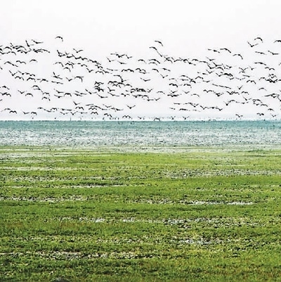 順著他手指的方向,只見大大小小的灘涂上,有黑點(diǎn)和白點(diǎn)在移動(dòng)。通過望遠(yuǎn)鏡一看,竟是一群群水鳥。水草在清澈的湖中搖曳,有的已經(jīng)高出了水面。