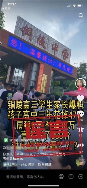 謠言:安徽銅陵一學(xué)生高中三年花費47萬元 高考考了369分?