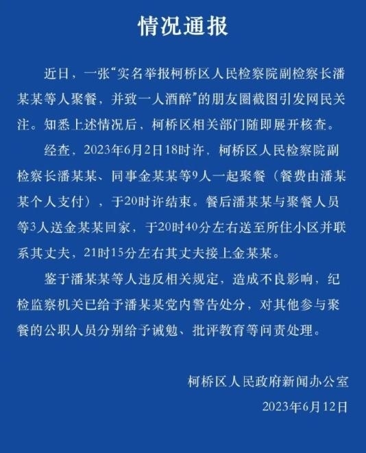 ·紹興一男子舉報妻子被上司帶去酒局遭灌酒,官方回應:給予處分。