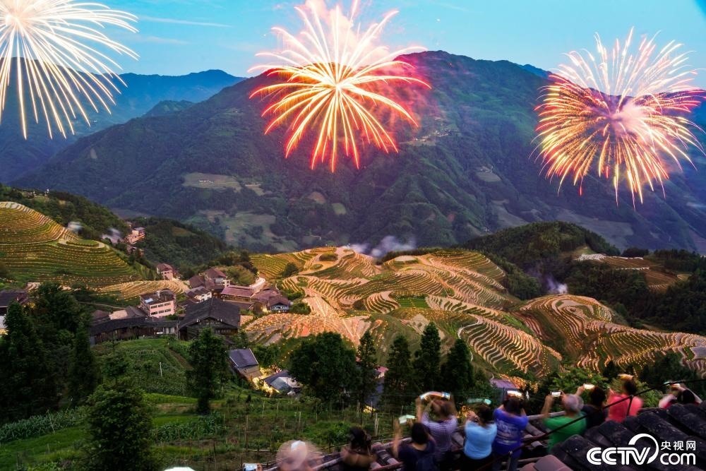 2023年6月10日,廣西桂林,龍勝龍脊梯田景區(qū)舉行一年一度的梳秧節(jié)。夜幕降臨,景區(qū)內層層疊疊的梯田里星星點點的火把漸漸亮起,絢麗煙花在空中綻放,景色如畫。