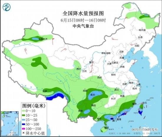 全國降水量預(yù)報圖(6月15日08時-16日08時) 圖自中央氣象臺網(wǎng)站