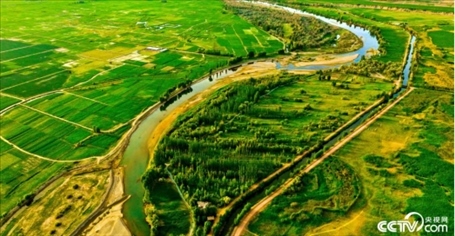2023年6月15日,甘肅省張掖市,甘州區(qū)靖安鄉(xiāng)、臨澤縣板橋鎮(zhèn)境內(nèi)的黑河兩岸,寬闊的河床、彎曲的河流、農(nóng)作物以及樹木、蘆葦、濕地在夕陽的映照下綠意盎然。