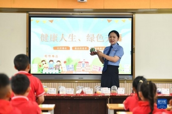 6月25日,民警在貴州省安順市禁毒宣傳教育基地為學(xué)生講解毒品相關(guān)知識(shí)。