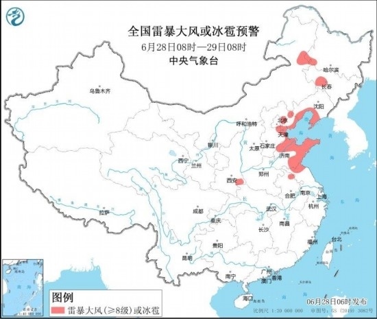 預(yù)計(jì),6月28日08時(shí)至29日08時(shí),遼東半島、北京東部、天津北部、河北東北部、山東中東部、四川東部、陜西南部、重慶大部、湖北西部等地部分地區(qū)有大到暴雨,其中,重慶北部局地有大暴雨(100~140毫米)。上述部分地區(qū)伴有短時(shí)強(qiáng)降水(最大小時(shí)降雨量30~50毫米,局地可超過60毫米),內(nèi)蒙古東北部、黑龍江西南部、吉林中西部、遼寧南部、陜西東南部、河北東部、北京東部、天津、山東北部和東部、安徽北部、江蘇北部等地的部分地區(qū)將有8~10級(jí)雷暴大風(fēng)或冰雹天氣,局地風(fēng)力可達(dá)11級(jí)(見圖1和圖2)。中央氣象臺(tái)6月28日06時(shí)繼續(xù)發(fā)布暴雨藍(lán)色預(yù)警和強(qiáng)對(duì)流天氣藍(lán)色預(yù)警。