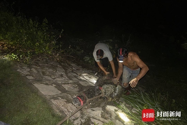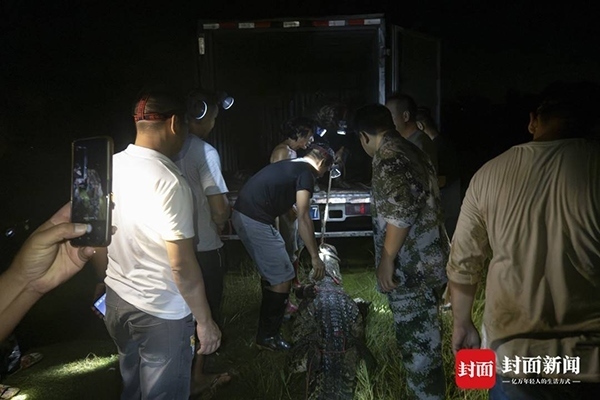 9月16日深夜,封面新聞?dòng)浾邚膹V東茂名茂南區(qū)“出逃”暹羅鱷抓捕現(xiàn)場(chǎng)獲悉,當(dāng)夜有3條暹羅鱷被專業(yè)人員從養(yǎng)殖場(chǎng)外的水域中抓捕上岸。9月11日,茂南區(qū)一鱷魚養(yǎng)殖場(chǎng)因洪水沖塌圍墻造成部分鱷魚“出逃”,經(jīng)過(guò)連續(xù)6天的搜尋,截至16日24時(shí),養(yǎng)殖場(chǎng)中原養(yǎng)殖的71條暹羅鱷已有69條被抓獲,僅剩2條仍在搜尋。