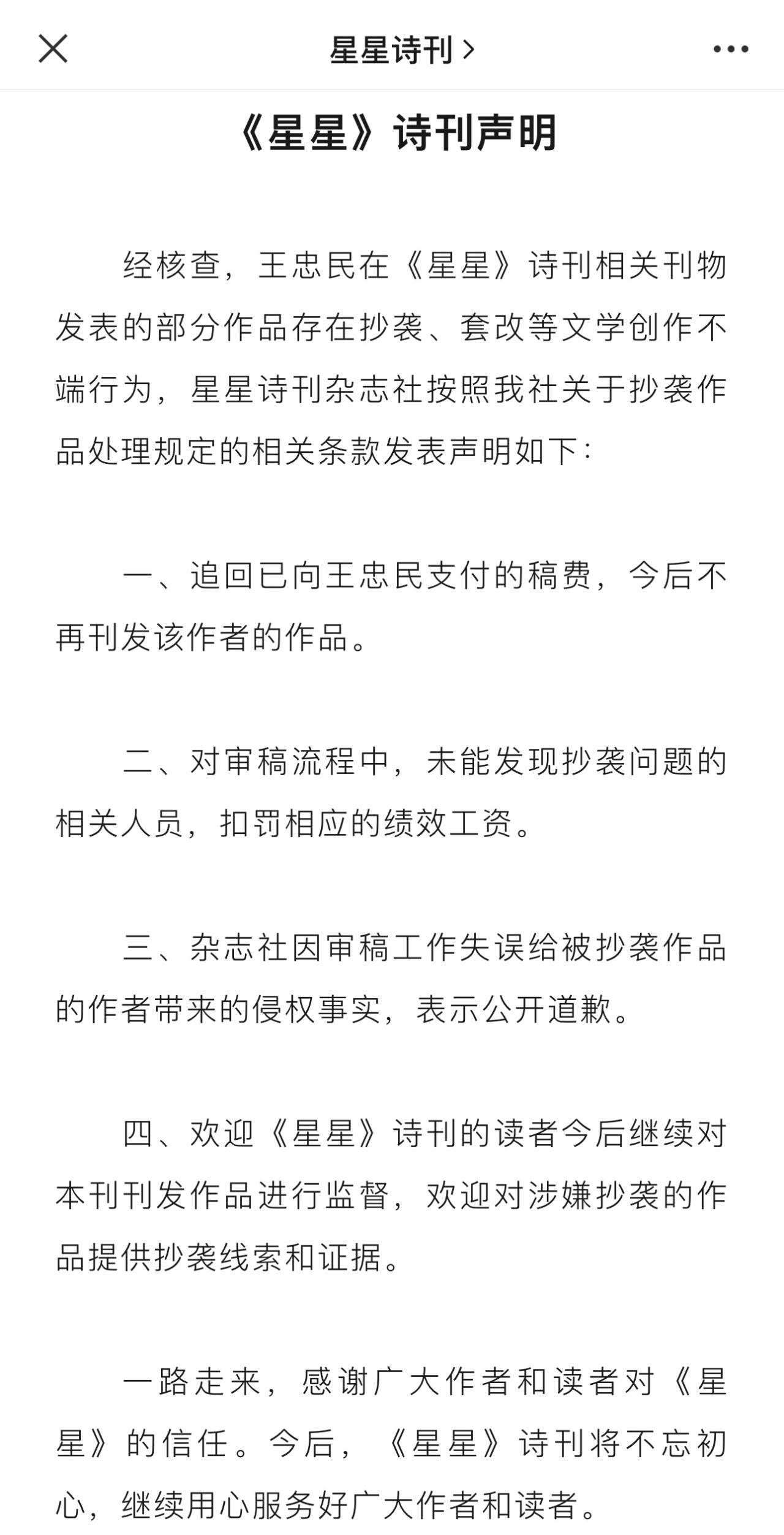 《星星》詩刊雜志社稱,按照該社關于抄襲作品處理規(guī)定的相關條款,追回已向王忠民支付的稿費,今后不再刊發(fā)該作者的作品;對審稿流程中,未能發(fā)現(xiàn)抄襲問題的相關人員,扣罰相應的績效工資。