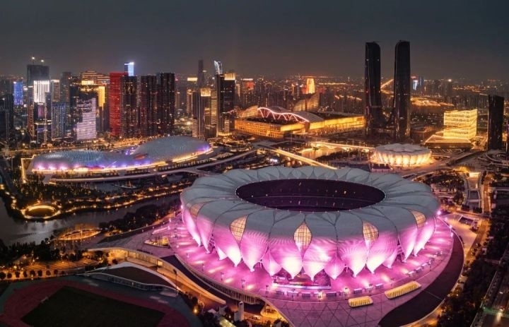 比如充滿想象的場館設(shè)計。錢塘江畔的“大蓮花”,其建筑體態(tài)源于錢塘江水的動態(tài),給人以震撼的同時,也“盛放”出浙江的文化底蘊和藝術(shù)魅力;“水?!杯h(huán)繞的手球館,外觀別具一格,“條條水?!贝孤浜苁俏Γ灰浴昂贾輦恪睘樵煨偷那髑驁?,則詮釋出江南古典美學(xué)十足的浪漫韻味。