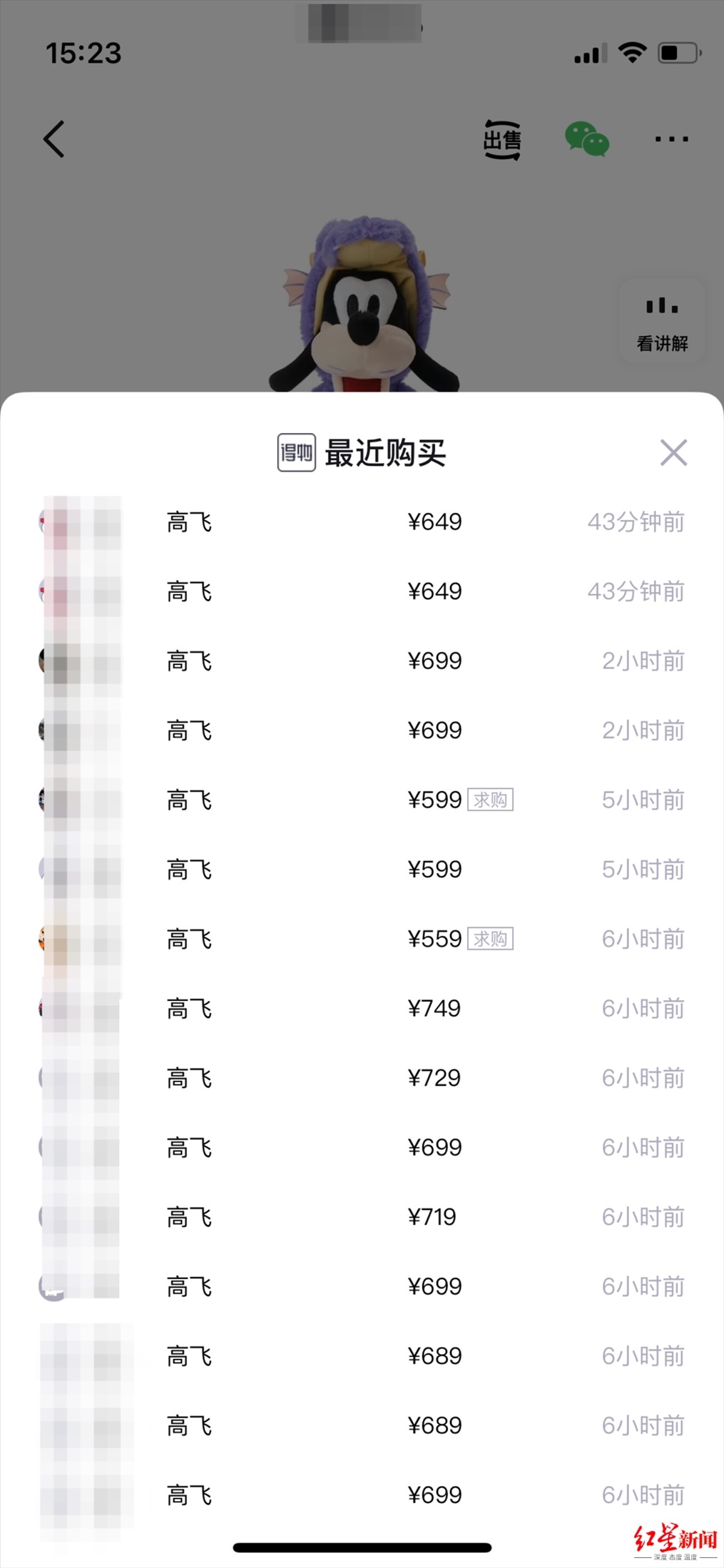 這名網(wǎng)友最終在迪士尼地鐵站附近從他人手中購(gòu)買了“紫龍高飛”系列商品。據(jù)其描述,兜售者是名男子,隨身攜帶大量“紫龍高飛”鑰匙圈、毛絨玩具,現(xiàn)場(chǎng)不少人詢問(wèn)價(jià)格?!拔覇?wèn)能不能只買一樣,他說(shuō)是一套賣的,愛(ài)買不買?!痹摼W(wǎng)友向紅星新聞出示了付款記錄稱,當(dāng)天下午兩點(diǎn)多,其支付了850元,購(gòu)買了“紫龍高飛”鑰匙圈和毛絨玩具,兩件商品原價(jià)合計(jì)318元。