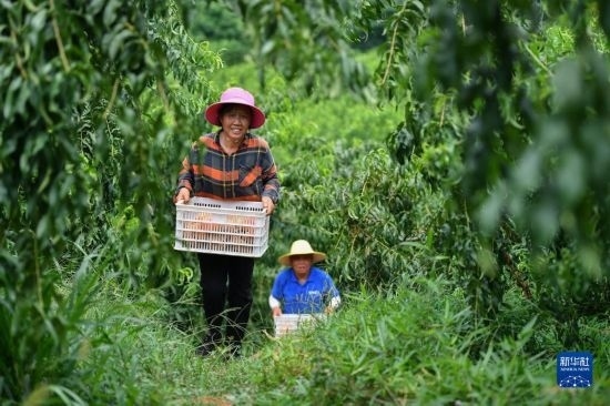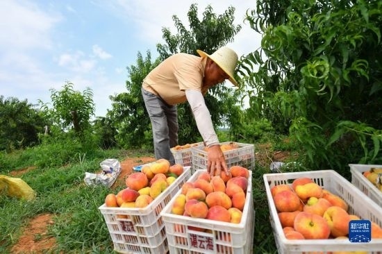 7月7日,在臨湘市聶市鎮(zhèn)乘嶺社區(qū)的涓湖果園,果農在采摘蟠桃。