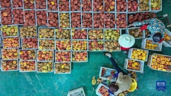 7月7日,在臨湘市聶市鎮(zhèn)乘嶺社區(qū)的涓湖果園,果農在分揀蟠桃(無人機照片)。