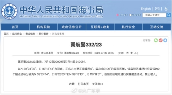 ·航行警告!7月10日0時(shí)至7月14日24時(shí),渤海部分海域進(jìn)行實(shí)彈射擊活動,禁止駛?cè)搿?/p>