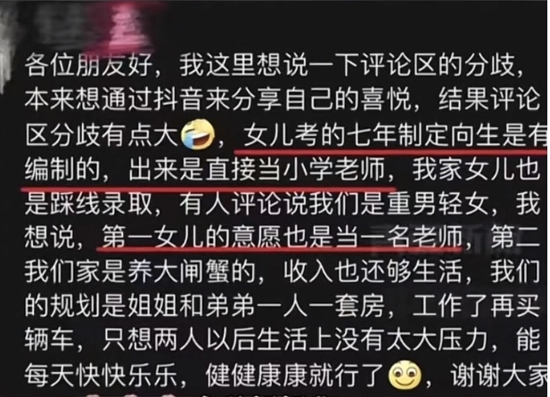 據女孩媽媽稱,孩子考的“七年貫通培養(yǎng)師范定向生”是有編制的,出來直接當小學老師。家里不缺錢,只希望姐弟倆以后生活輕松快樂。