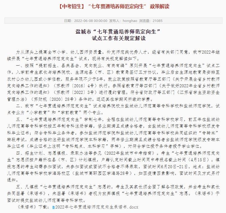 記者從鹽城幼兒師范高等??茖W校官網看到,鹽城市從2021年起開始試點培養(yǎng)“七年貫通師范定向生”,試點培養(yǎng)院校為鹽城幼兒師范高等??茖W校和鹽城師范學院,試點專業(yè)為“小學教育”和“學前教育”兩個專業(yè)。