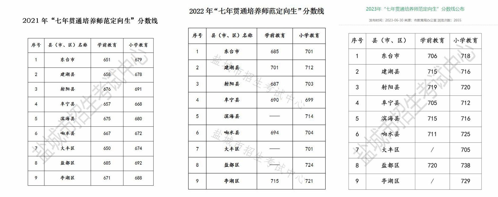 根據鹽城市教育局公布的2021年-2023年“七年貫通培養(yǎng)師范定向生”分數線來看,該項目的錄取分數線也在逐年升高。學前教育專業(yè)錄取分數線從最高685分升至最高720分,小學教育專業(yè)錄取分數線從最高692升至最高738分。