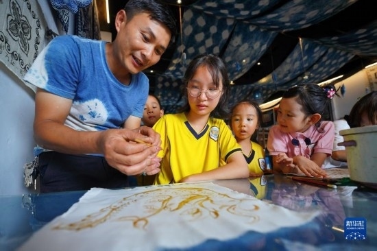 7月12日,在貴州省丹寨縣萬(wàn)達(dá)小鎮(zhèn)一家苗族蠟染非遺體驗(yàn)館,小朋友在非遺傳承人的指導(dǎo)下畫(huà)蠟畫(huà)。