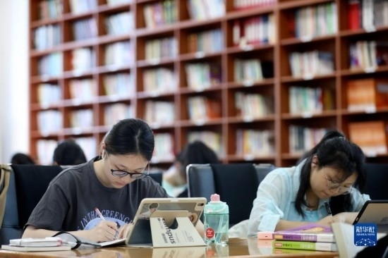 7月12日,幾名學(xué)生在湖南省資興市圖書(shū)館學(xué)習(xí)。