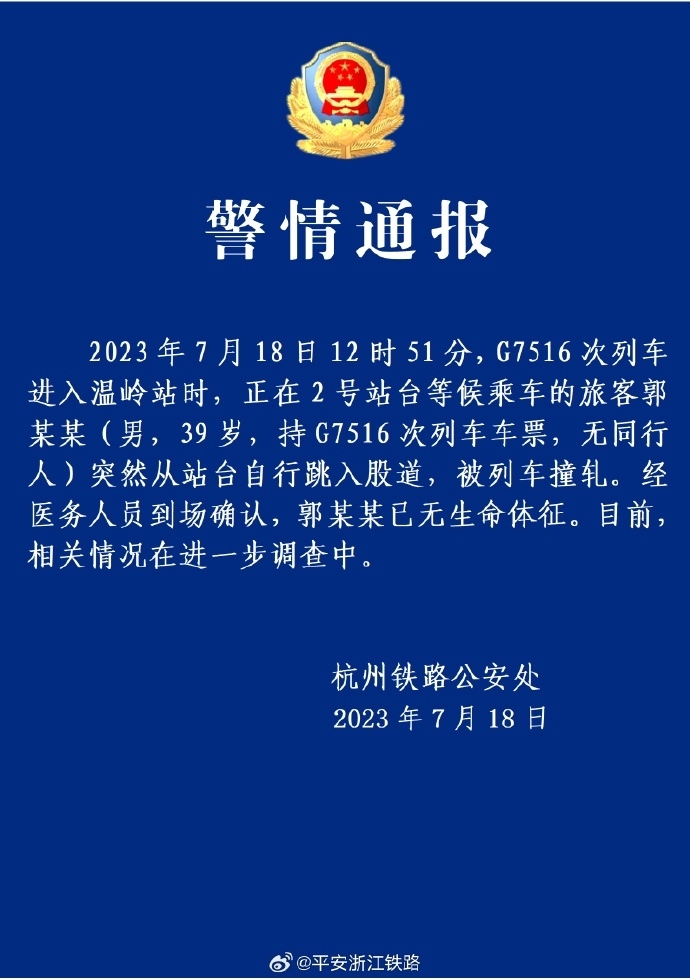·警方通報(bào):溫嶺跳下高鐵站臺男子已無生命體征。