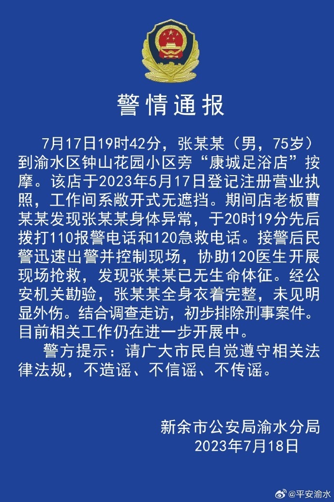 ·警方通報(bào)7旬男子按摩店內(nèi)死亡:其衣著完整未見明顯外傷,初步排除刑事案件。
